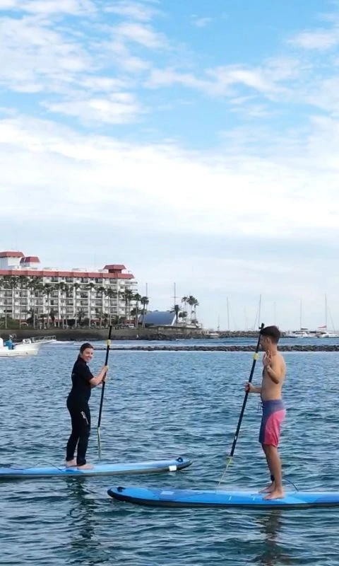材木座の海で楽しむSUP体験。穏やかな波の上で心も体もリフレッシュできます。提携のウィンドサーフィンスクール「SEVENSEAS」でSUPの体験スクール受講やレンタルが可能です。