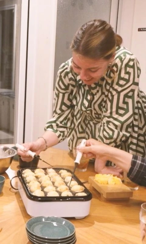 たこ焼き機を使って、リビングでの会話も弾むたこ焼きパーティーを。ゲストハウスならではの楽しみ方です。