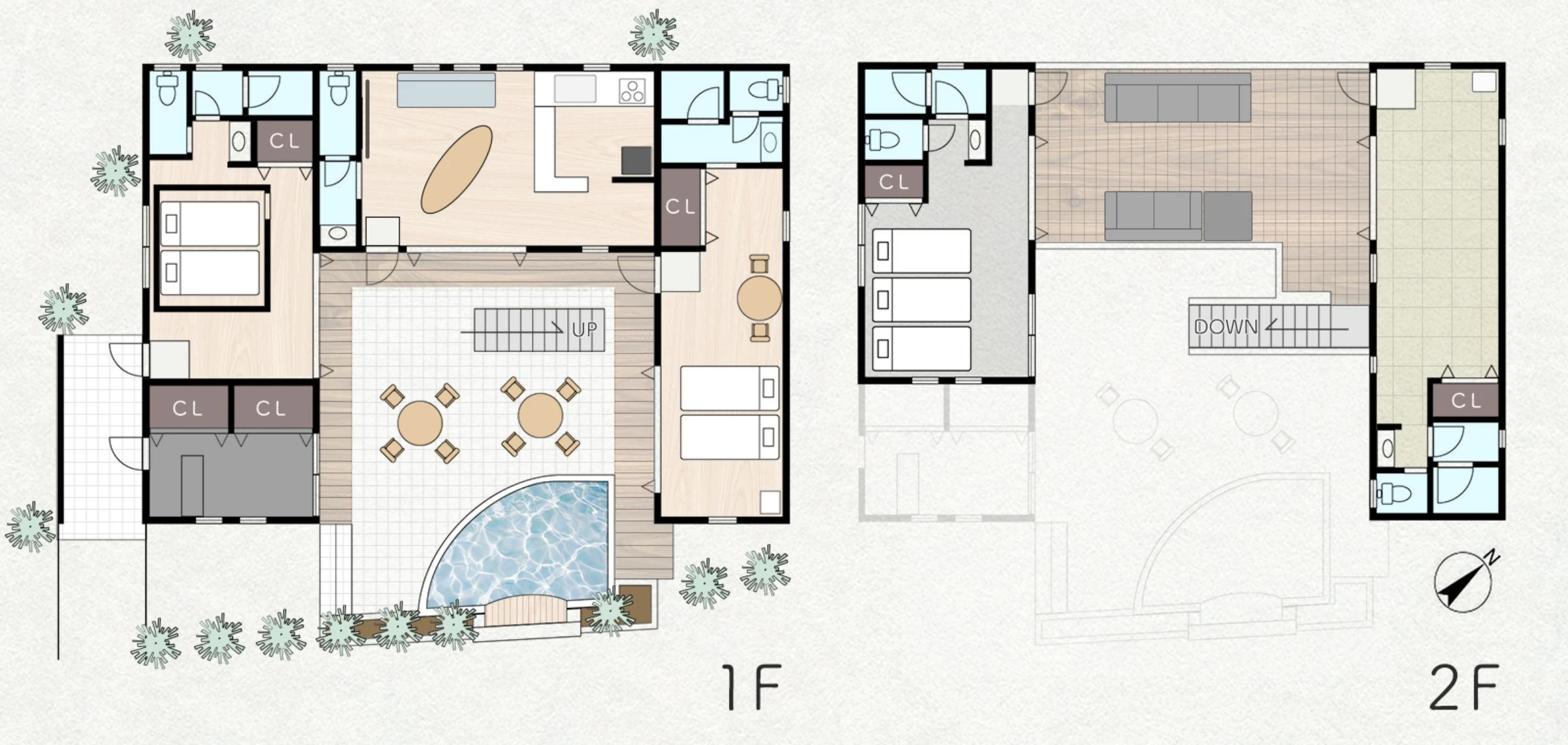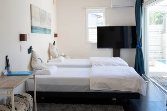 各客室はシャワールーム、トイレ、洗面所が独立しており、また部屋ごとに冷蔵庫を完備しています。1階の客室はガーデンプールに直結しており、開放的な空間でお過ごしいただけます。2階の客室にはルーフバルコニーがあり、海風を感じながら心地よいひとときをお楽しみください。