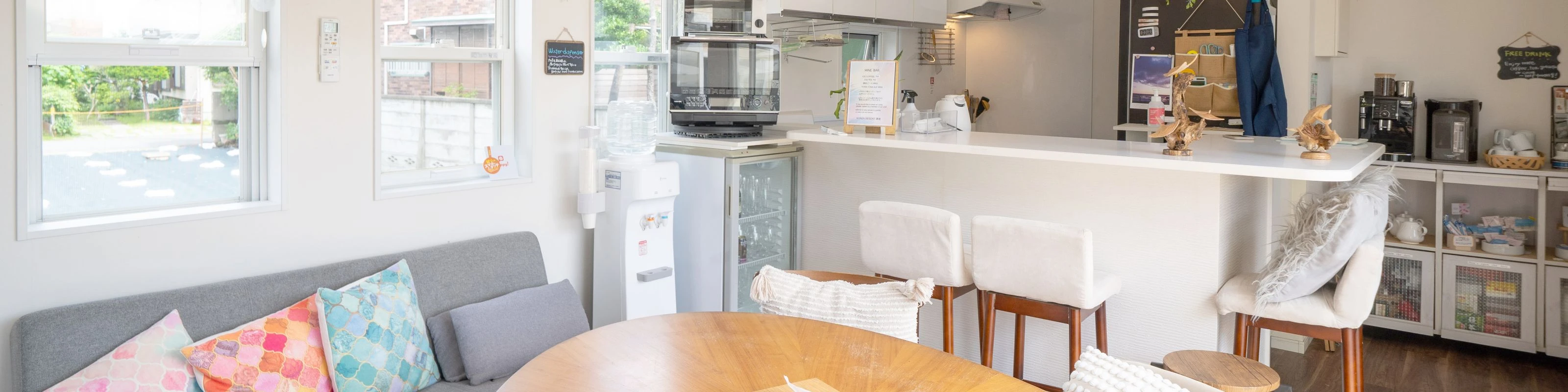 共有キッチンには調理器具や食器を完備。地元食材を使った料理や、仲間との食事作りを楽しめます。自由な滞在スタイルをサポートします。