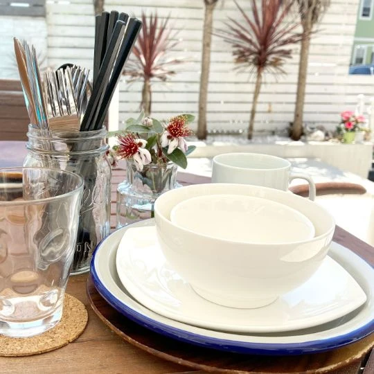 白を基調とした開放的なテラスは、海風を感じながらリラックスできる特別な空間。朝のコーヒーや夕暮れの語らいにぴったりの場所です。