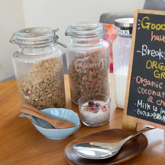 フリードリンクとして、ウォーターサーバーのほか、コーヒー・紅茶・緑茶・ココアをご自由にお飲み頂けます。朝食には、グラノーラと牛乳を提供しております。