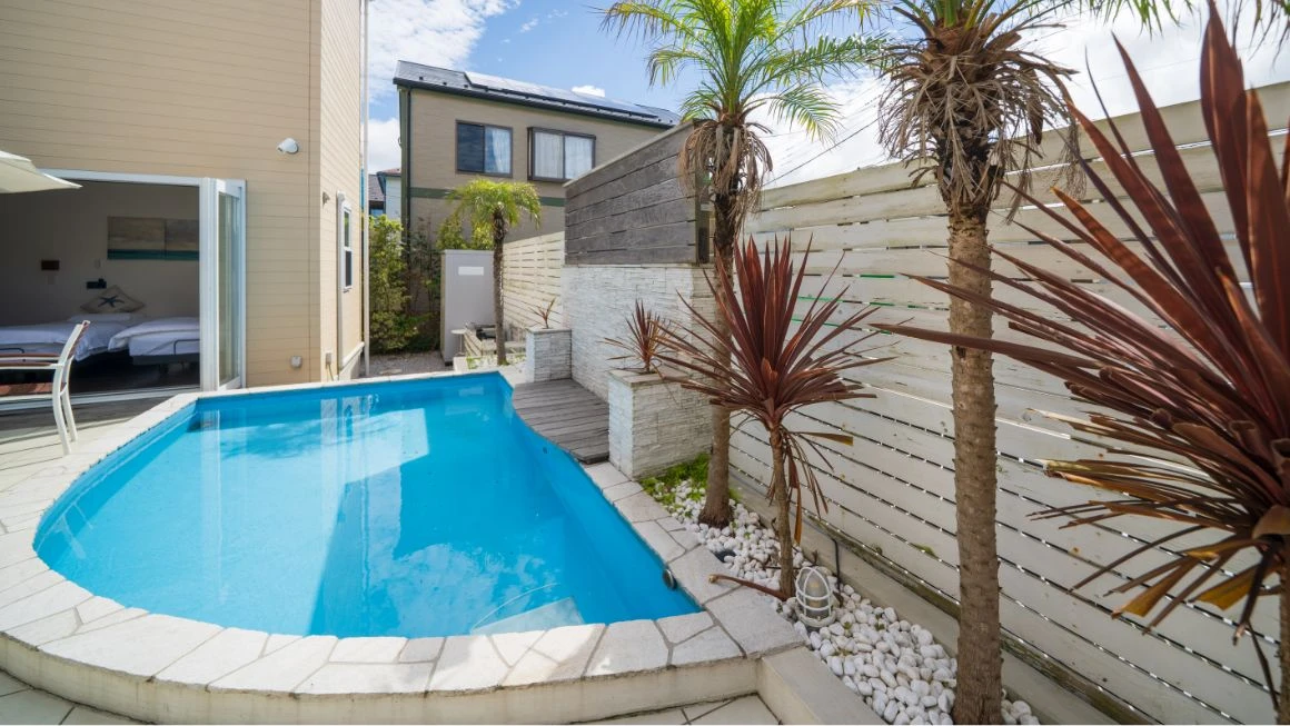 一棟貸切のお客様がご自由にお使いいただける空間です。開放感あふれるリビングでは、プールを望みながらくつろぎの時間を。白を基調とした空間で、ドリンク片手にゆったりとしたひとときをお楽しみいただけます。リビングには貸切のお客様専用の冷蔵庫を完備。(各部屋にも冷蔵庫は設置しております)