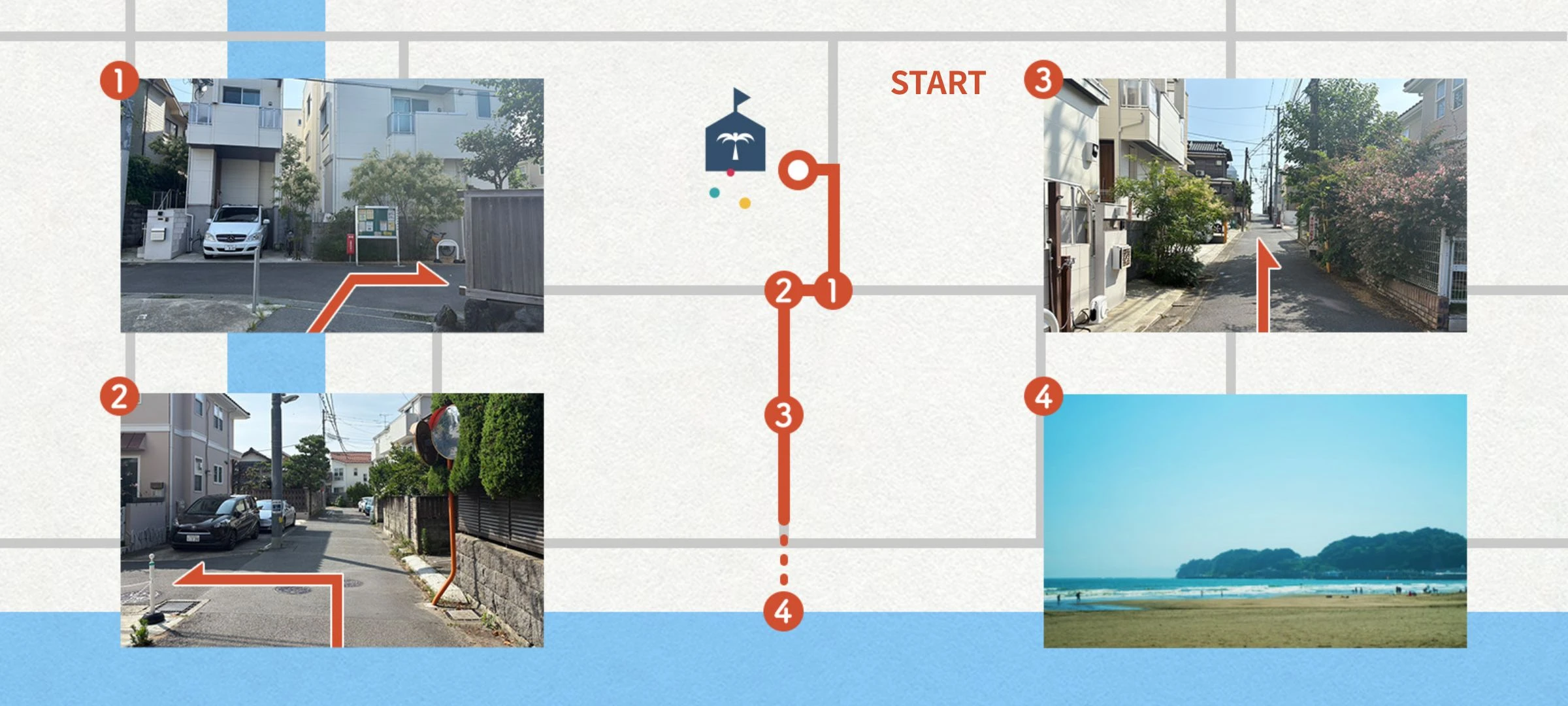 (1)のT字路を右へ曲がり、(2)のT字路を左へ。(3)しばらく直進すると海が見えてきます。階段を降りてトンネルを抜けると(4)の海岸に到着です。
